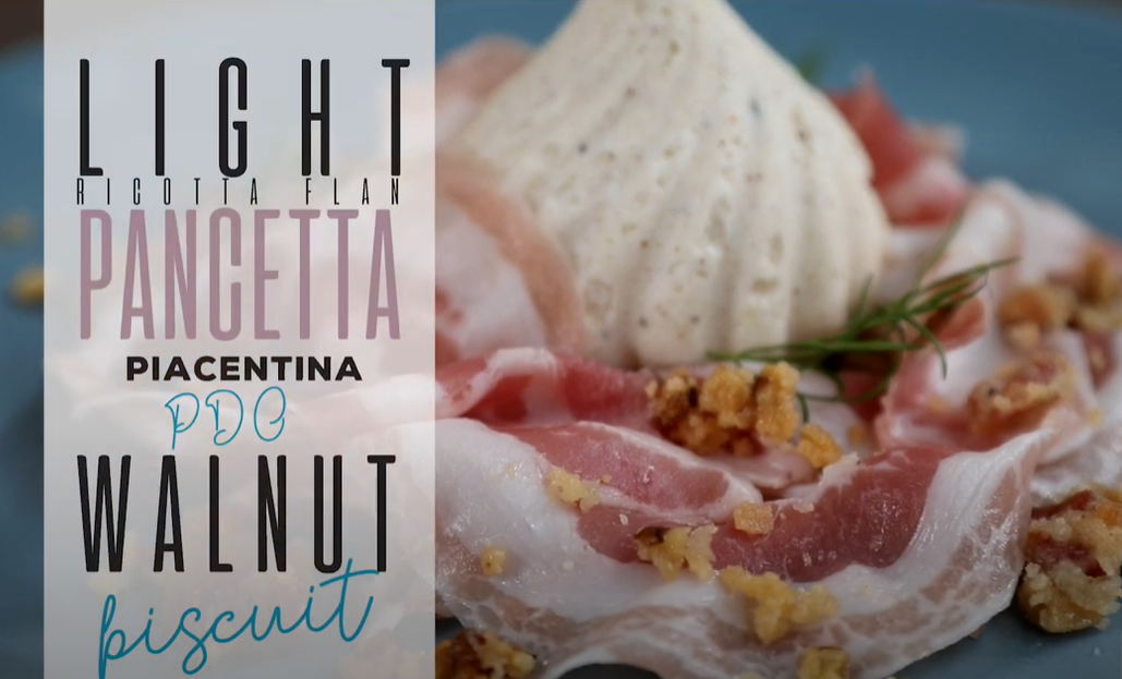 LIGHT RICOTTA FLAN, Pancetta Piacentina PDO, WALNUT BISCUIT
